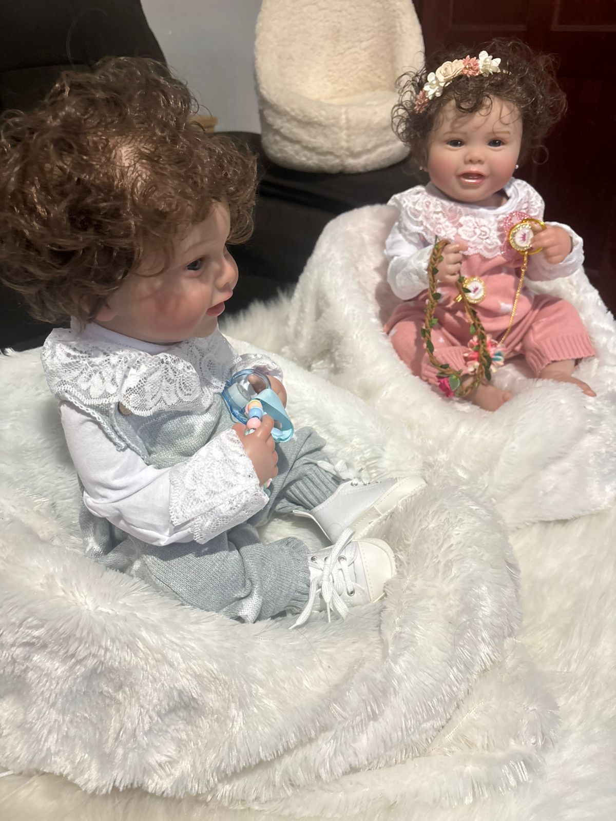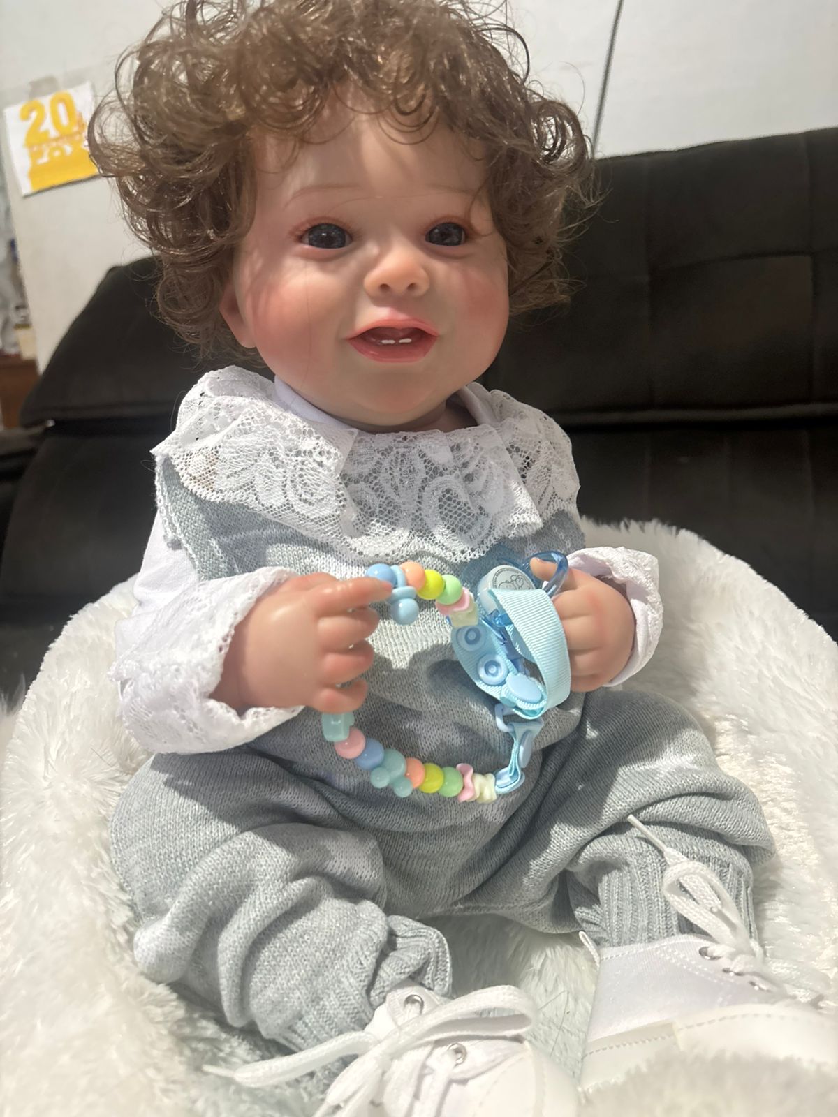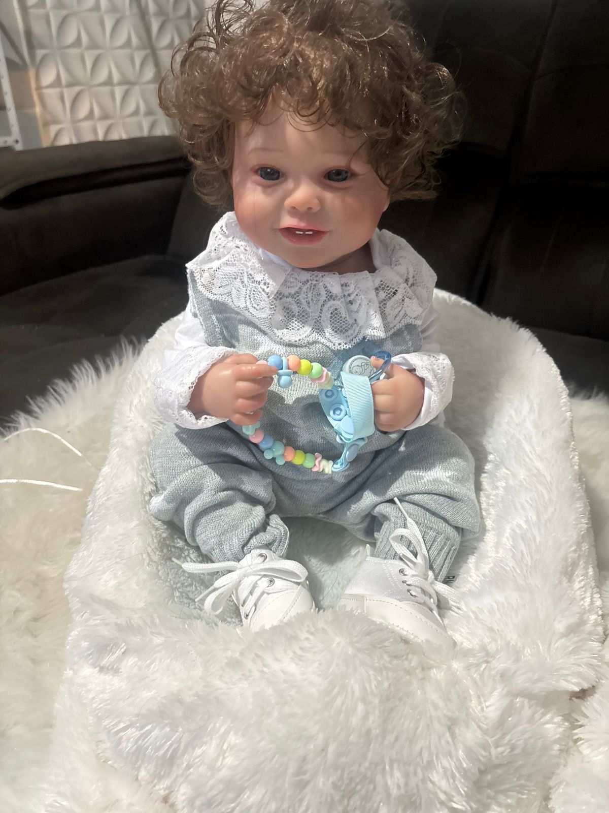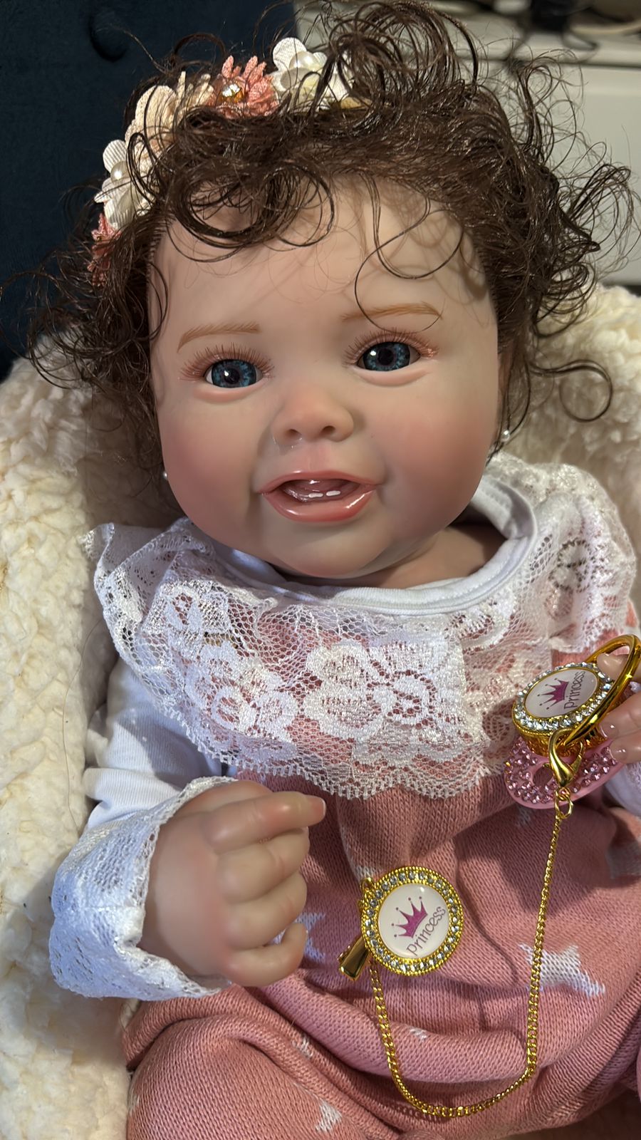 O cabelo é enraizado fio a fio, com sobrancelhas pintadas, e os olhos úmidos dão um efeito natural. A boneca pode ser movimentada livremente e até tomar banho, facilitando o cuidado e manuseio.