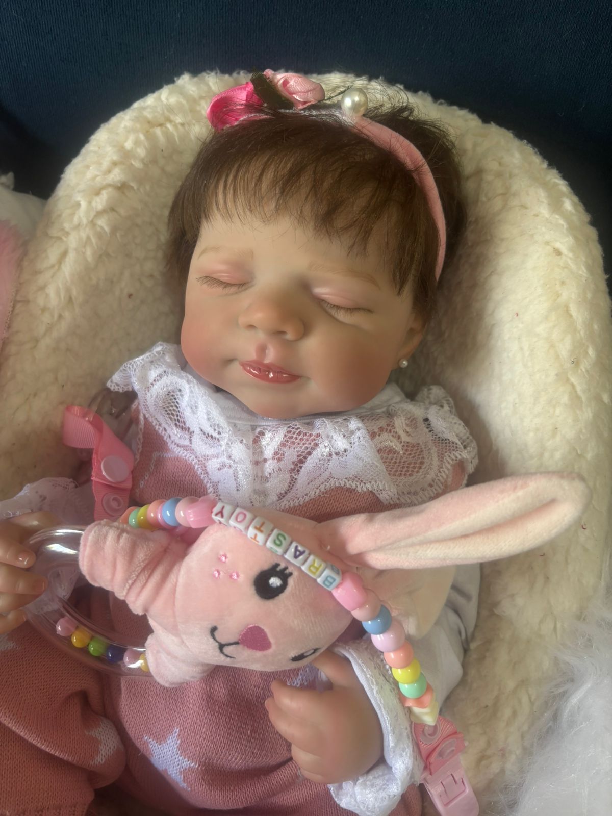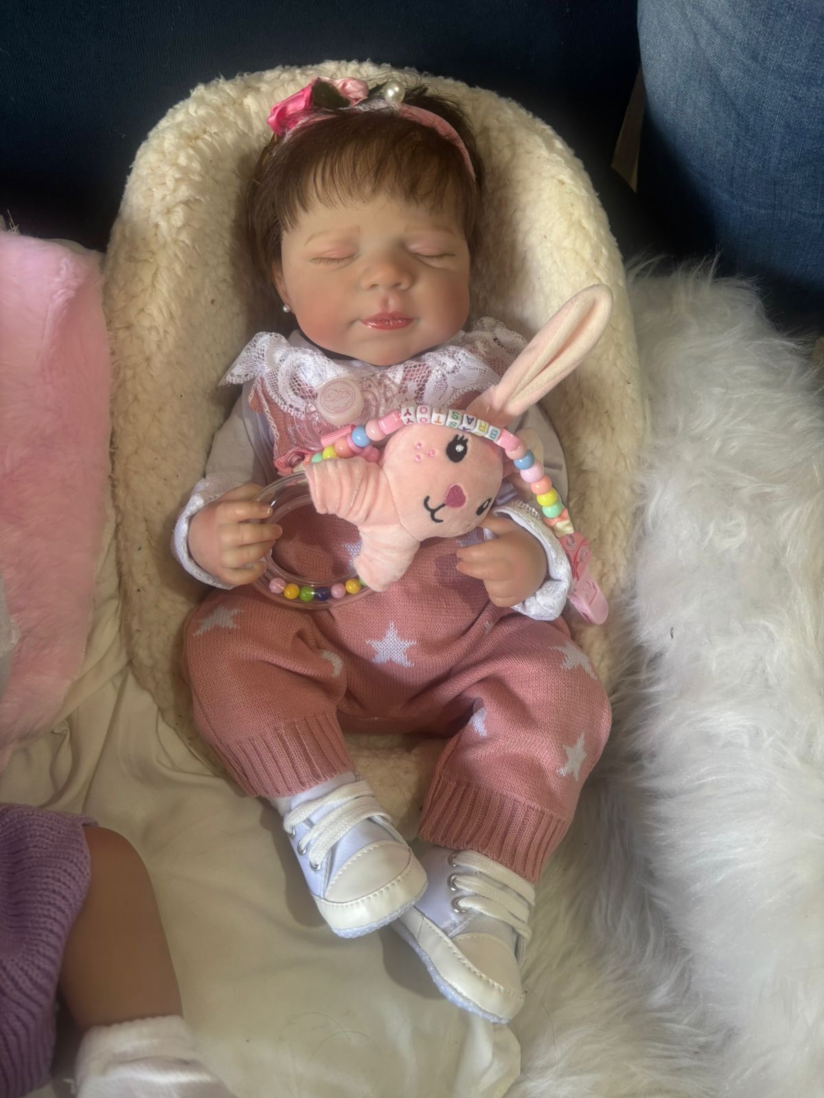 O cabelo fio à fio implantado na mão confere um visual único e adorável. O vestido acompanha exatamente o modelo da foto, e você pode trocar as roupas da boneca por peças tamanho Premie, ampliando as possibilidades de customização e diversão.